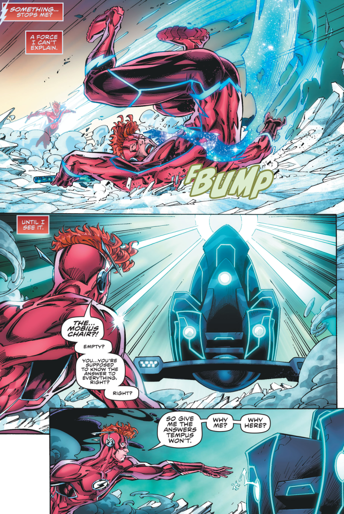 Tempus attempts to tell Wally what his grand purpose on this planet is, but in his anger Wally attacks him like a gnat and then proceeds to try and ride the planet of it’s Dark Multiverse energy. Wally is the Fastest Flash Alive and the art team stresses that as they show the planet and then show streaks of blue where Wally has been, crossing the planet multiple times until he’s stopped by something unexpected: The Mobius Chair. The Mobius Chair was created by the New God Metron and allows the user to see all of the secrets to the universe. With Metron having been killed by a mysterious entity (Doctor Manhattan) in DC Rebirth, the chair lies empty.