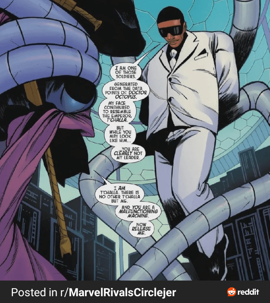 I don’t have enough words to describe how much this line made me howl with laughter. The absurdity of the name, the look on T’Challa’s mask as he realizes that his further space adventures are about to be utter nonsense and the sheer bafflement of the clones existence makes a perfect bow on this present of a reveal. And since I am all for context, the panel preceding it:
